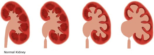 Гидронефроз начинается с расширения почечных чашечек. В норме форма чашечек вогнутая, но повышение внутрилоханочного давления приводит к уплощению и округлению почечных чашечек. Паренхима, расположенная между чашечками повреждается меньше и является тем резервом, из которого при восстановлении оттока мочи происходит регенерация почечной ткани.